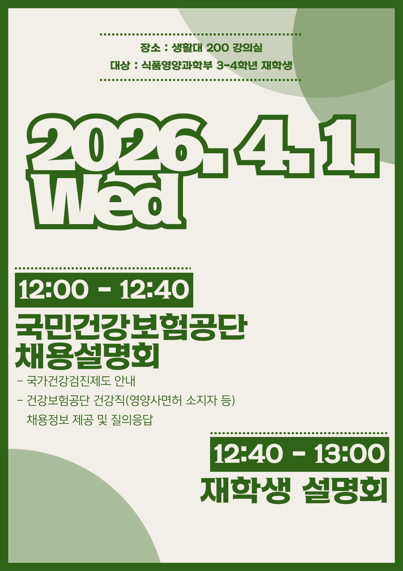 3~4학년 대상으로 2026학년도 식품영양과학부 재학생 설명회를 실시합니다. 많은 참여 부탁드립니다.